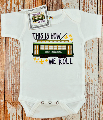 “THIS IS HOW WE ROLL” with a cute New Orleans Streetcar, is on the front of your onesie. The image is made using heat transfer vinyl.